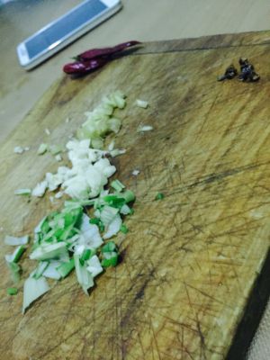 用剩余油,爆香花椒,喜欢麻麻地感觉就继续放小米椒,葱姜蒜末