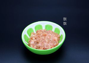 五花肉剁碎,用盐,料酒,老抽和生抽腌制20分钟