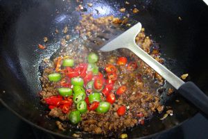 待肉沫焦熟有香味溢出时加入青红椒炒香,并放适量的开水进去,不要放冷水,会影响肉的口感,辣椒也会变的不好看