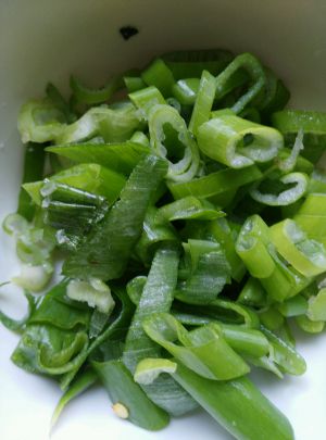 蒜苗切段,蒜头和姜切末,一勺妈妈做的酸辣椒备用(没有酸辣椒用小红椒切段也可以)