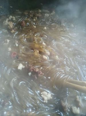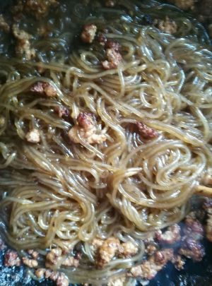 粉丝吸干油脂,即将粘锅前倒入调汁汁,并根据自己情况续入适量清水。