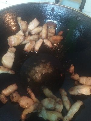 大蒜、小米辣、姜丝下锅炒香,加酸笋炒香,再放肉片翻炒,加盐。