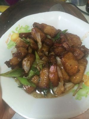 上色后放入料酒,酱油,蚝油翻炒,把切好的大葱放下去一起继续翻炒