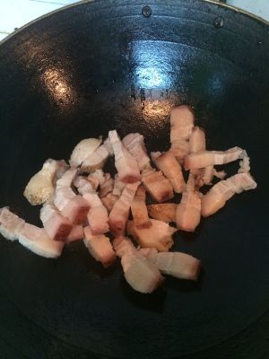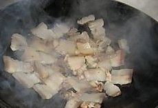 五花肉冷水下锅煮,放姜酒一起,煮至可以用筷子轻易插入就可以了,然后切小块,冷锅慢火炒,把油逼出来