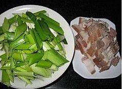 五花肉一块,青蒜一捆,洗干净五花肉下锅煮至八分熟,即筷子能扎透的程度青蒜斜切块,肉切薄片