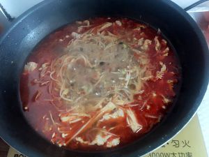 9、炒好配料后,加入清水(锅的五分之二),水开后,迅速用筷子挑肉下锅,注意把肉挑散,肉全下完后大火煮一分钟;下入金针菇,豆芽,两分钟后关火。
