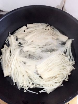 1、将金针菇发黄的部位切掉,水烧开后放入金针菇大火煮三分钟,沥干备用。
