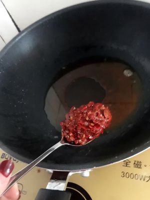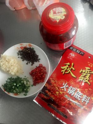8、油烧至八成热,花椒炒香后,将花椒捞出;放入豆瓣酱炒至油呈红色;依次放入朝天椒炒至辣味释放;放入蒜末炒香、;入火锅底料、将块状炒至完全散开。