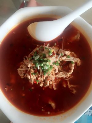 汤也一起倒入容器中,然后将干辣椒,花椒,蒜末放在最上面,锅中倒入油烧热,将热油泼在蒜末上即可。