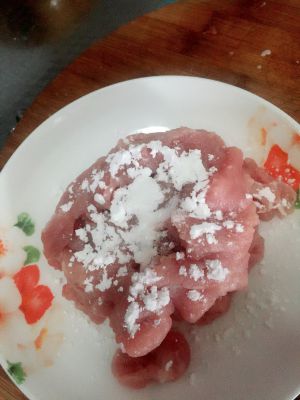 5、加入一勺生粉,盐,腌制10分钟。