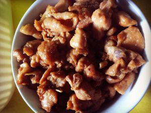 整鸡腿去骨,切大块,放碗中,加葱姜蒜碎、花雕、生抽、少量陈醋、辅料中的各种粉,盐适量,糖,淀粉抓均匀,上图还没加淀粉,腌制半小时以上
