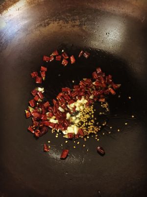 锅里留少许油入蒜末、花椒,小米椒翻炒出香味。