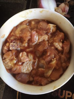 三只鸡腿,把肉从骨头上剃下来,切成小快。为了后面入味,切小了。放入生姜。蒜,葱段,料酒,盐,酱油,腌制半个小时。