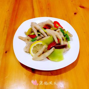 泡椒水制作:纯净水中加入盐、姜片、柠檬片三四片、红椒丝、芹菜段、莴笋片、洋葱丝,再倒入200g小米辣泡椒,(连同泡水一起倒入,如果喜欢辣可将小米辣剪开),加入少许白糖调匀,泡椒水制作完成了。将备好的凤爪倒入泡椒水中浸泡8一12个小时,凤爪入味即食用。 PS:剩下的柠檬给自己制一份柠檬蜂蜜水吧,开水/冰水中放入1勺蜂蜜,2片柠檬,搅拌3下,酸酸甜甜,算给自己的奖励吧,嘿嘿~~~