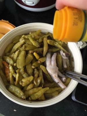 鸡爪放入容器中,再倒入泡椒和泡椒水,如果淹住鸡爪就不用放盐了,如果没淹住鸡爪再倒入凉开水过纯净水淹住,再放入一勺盐,因为泡椒水里面有盐分。