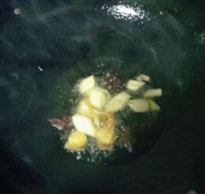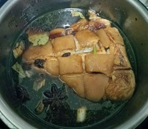 取一砂锅加入5两花雕酒、2两冰糖,放入肘子,加入八角、桂皮,待烧开后加入2两白砂糖、酱油盖上锅盖,以文火(黄豆大小的火苗)焖煮6小时,闷煮完蒸制1小时;