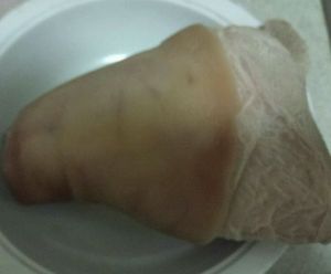 准备好一个肘子,去毛洗干净,肘子皮上的毛可以用燃气灶的火烧一下再洗干净
