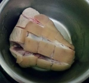 肘子、葱姜放入锅中,加入冷水,稍稍莫过肘子就行