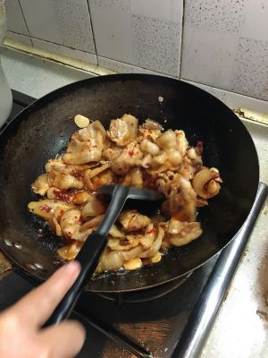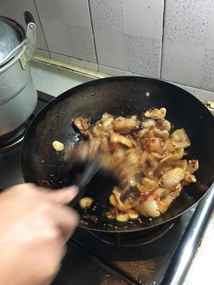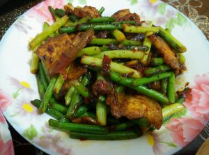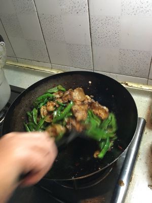 油锅,下豆瓣酱一大勺爆香,下肉片,翻炒几下,下蒜薹炒。