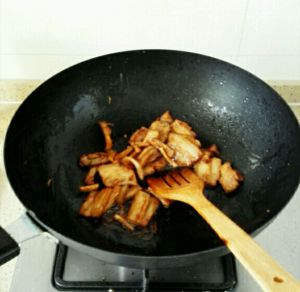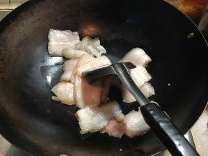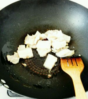 热锅倒入适量油,下葱姜爆香,小火(必须小火,带皮肉下锅会爆油,需小心)下入煮好切片的五花肉,翻炒