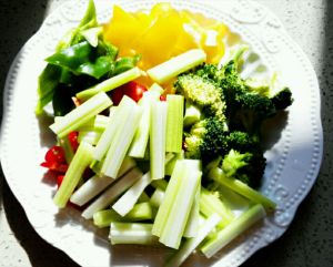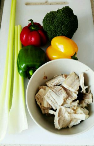 青红椒切菱形块,西芹切段,西蓝花掰成小朵。葱姜切好备用