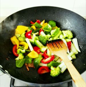 倒入所有蔬菜,大火翻炒,加入黑胡椒粉,白胡椒粉,翻炒,如果觉得干,可以加2勺水,大火翻炒,最后加糖,盐,翻炒出锅