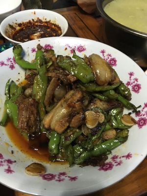 青椒下锅干扁,皮稍微有点焦的感觉后加少许菜油翻炒出锅(喜辣可以用细青椒,不吃辣的可以用大青椒)