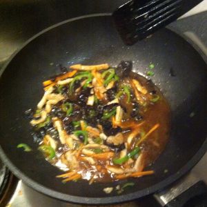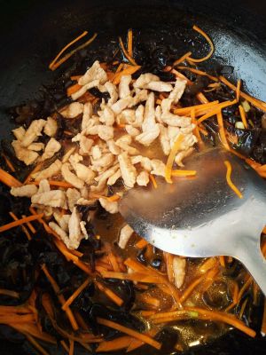 加笋丝、香菇丝继续炒,加肉丝,加黑木耳一起炒