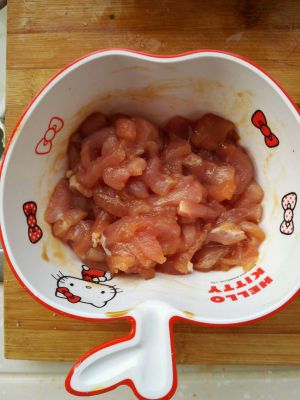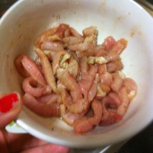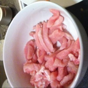 猪肉切丝,用酱油腌制