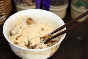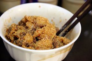 将炒熟米粉趁热拌入腌好的五花肉
