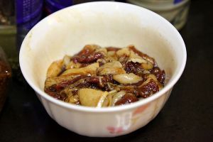 上好的五花肉连皮一起切成薄片,加入料酒老抽生抽(1:1:3)拌匀,腌至1-2小时。