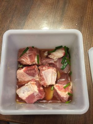 五花肉洗净切块后、和排骨一同搅拌腌制半小时左右即可