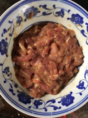 把肉切薄片放入碗中依次加入料酒,酱油,生抽,蛋清,薯粉,盐抓匀备用(调料根据个人口味适量放就可以)