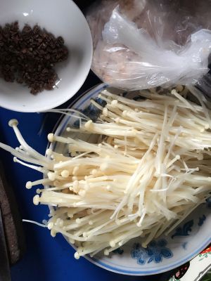 锅里加入油烧热倒入花椒的碗里备用,用锅里的余油炒黄豆芽和金针菇,炒好倒入砂锅里备用。锅里在加入油烧热依次加入豆瓣酱,姜,蒜末,酱油,生抽,料酒炒香加入适量热水煮开。煮开后转小火倒入腌好的肉片煮个4~5分钟倒入装有金针菇和豆芽的砂锅里,在继续煮开,煮个差不多关火拿下砂锅,这时把油炸的花椒和辣椒干放入砂锅里,在起锅烧油,油色浇在辣椒上即可。水煮肉片就做好了