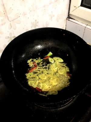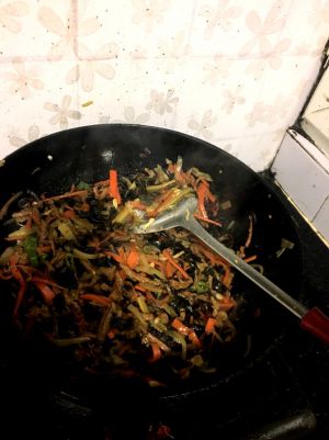 洗净锅后,再次倒入油,葱花、红辣椒、胡萝卜、嫩笋、木耳翻炒片刻