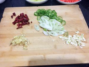 备好辅助材料:葱花、姜片、蒜末、青椒丝、花椒粒、干红辣椒