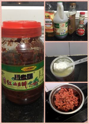牛肉里脊切丝,加豆瓣酱、加料酒、五香粉、花椒粉、水淀粉搅拌均匀后,腌制五分钟。将花椒粒、红辣椒、葱末放入碗中,调入生抽、醋、糖、耗油搅拌均匀后备用。
