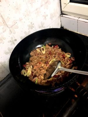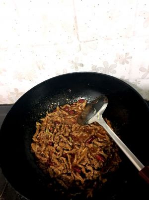最后加入炒好的肉丝及调味汁翻炒等到汤汁稍微变粘稠时,再次加入调好的淀粉汁迅速翻炒,装盘即可。