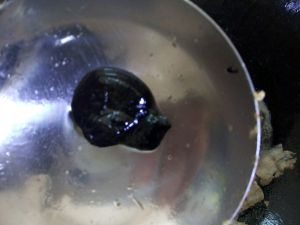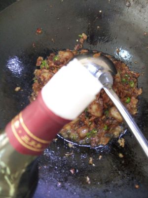 油入锅,放入切碎的蒜,蒜香后放入胡椒,干辣椒颗粒