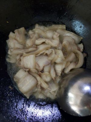 锅烧热,菜油适量 烧热后放五花肉熬出油。