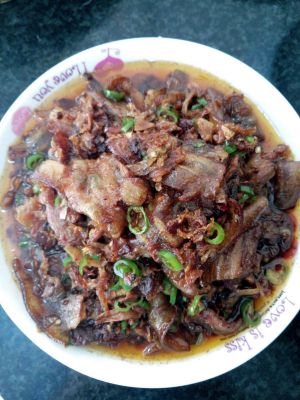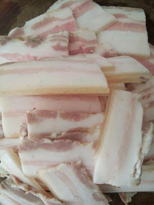 煮好的五花肉切片,厚薄适度!太厚不出油,太薄容易熬干。