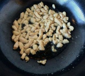 先加入鸡丁翻炒均匀,再加豆干丁,萝卜丁,黄瓜丁,翻炒