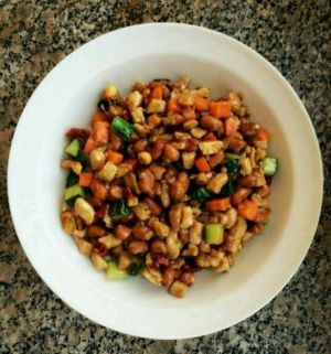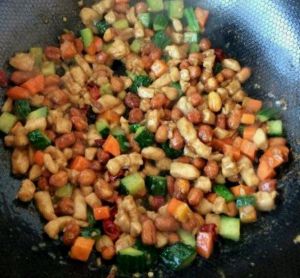 依次加入黄瓜 胡萝卜 花生米翻炒,然后淋上调好的汁