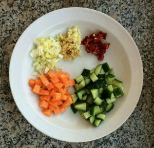 黄瓜 胡萝卜切丁,辣椒切段葱姜蒜切末备用。