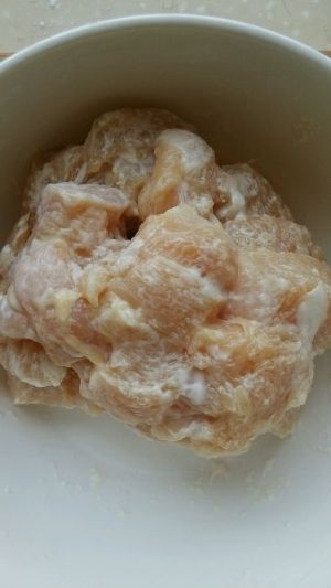鸡腿切丁,加淀粉,鸡蛋,料酒,酱油,少许盐,抓拌均匀腌制10分钟
