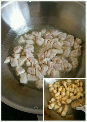 捞出花生米之后,将步骤2中的鸡肉丁放入油锅中炸至金黄色后,盛出,沥干油,备用!