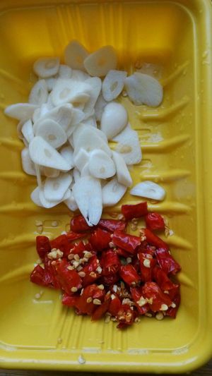 干辣椒和大蒜清洗干净,大蒜切片,干辣椒切成小段。