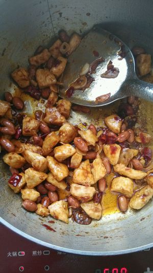 等调料煸香之后,加入炸过的鸡肉丁和花生米,翻炒均匀,即可出锅!