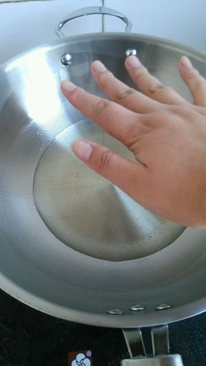 空锅加热,等锅身已经热了之后,加入适量食用油。等油温达到六成热时(用手放在油的20cm左右的上方,手心感觉到热度就可以了!),就可以放花生米炸了!