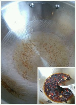 锅中留底油,加一勺郫县豆瓣酱,炒出红油